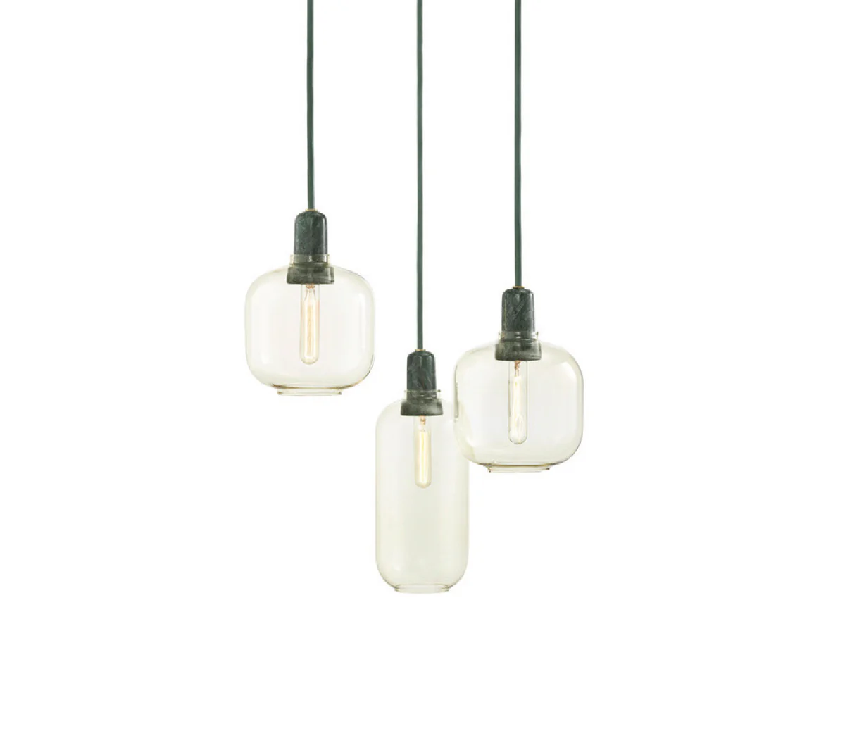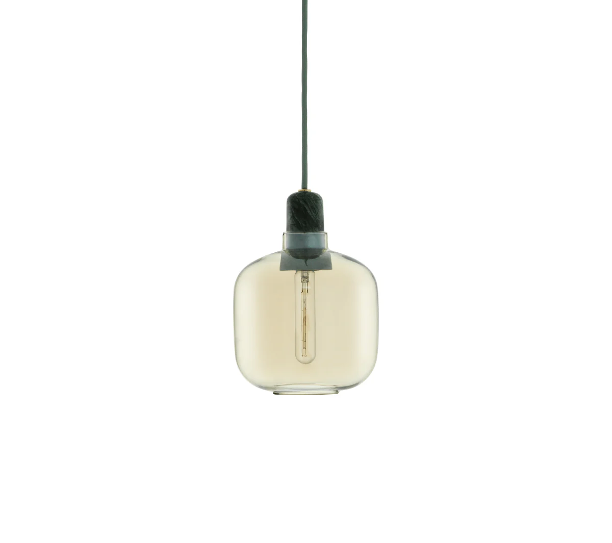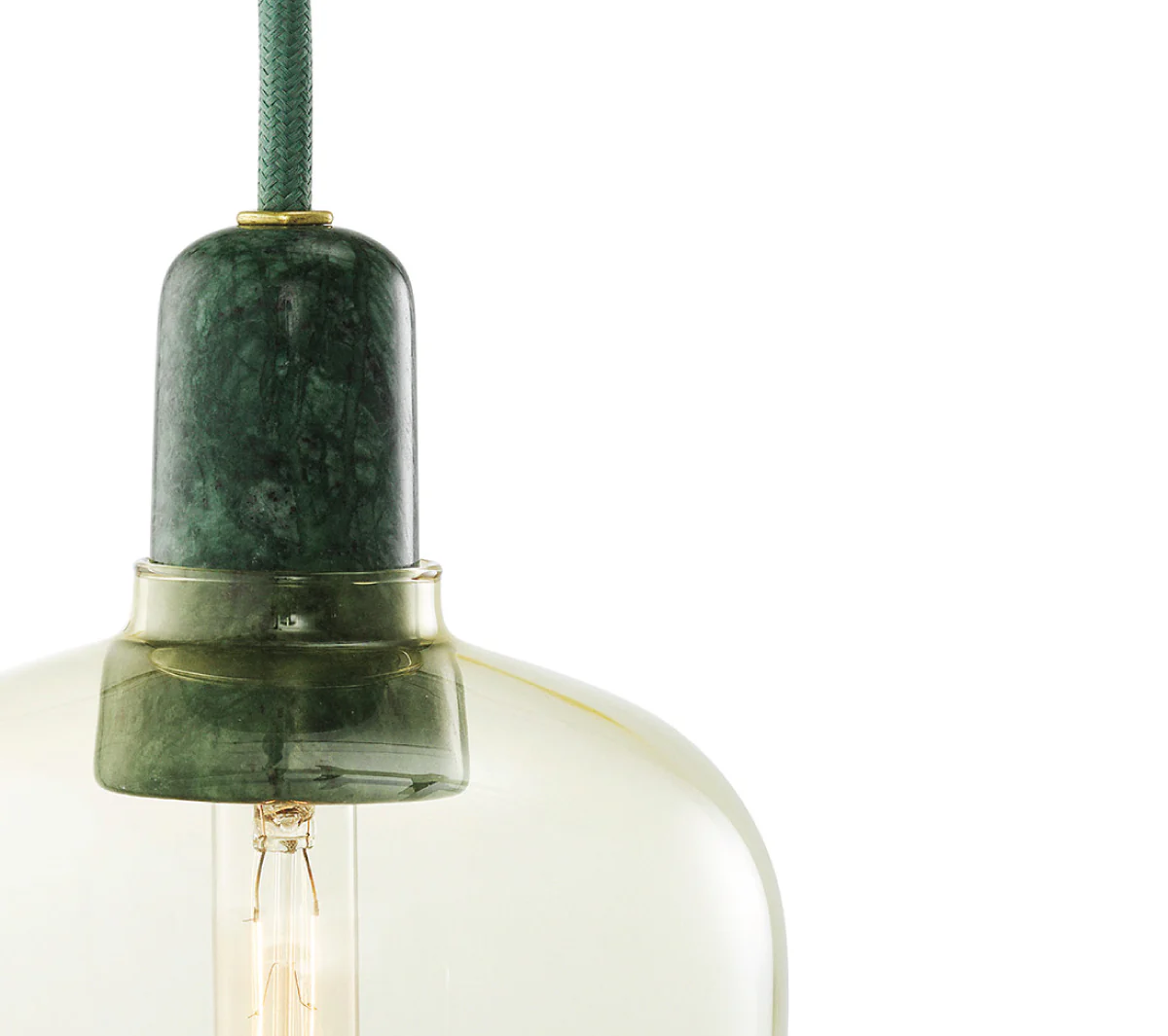 Il disegnatore danese Simon Legald ha disegnato per Normann Copenhagen una raffinata serie di lampade, chiamata Amp. La serie si compone di una lampada da tavolo e di due lampade a sospensione. Amp si caratterizza per i suoi materiali di qualità in vetro e marmo, che conferiscono da una parte una certa fragilità visiva e d’altra parte uno spessore fisico. Un’espressione nostalgica e contemporanea allo stesso tempo. L’idea alla base della forma della lampada nacque un giorno nel quale il disegnatore stava rimettendo a nuovo, a casa sua, una vecchia radio degli anni ’60. Durante la sua ricerca di pezzi di ricambio, fu attratto dall’incandescenza che emetteva l’amplificatore a tubi. La semplice forma ovale e la luce della lampada sono un chiaro riferimento all’amplificatore, ed anche il nome Amp viene dall’abbreviazione inglese di tube amplifier, amplificatore a tubi. Le singole proporzioni della lampada sono state create con molta cura. Ad esempio, le due lampade a sospensione hanno il portalampada in marmo più piccolo rispetto alla base di marmo della lampada da tavolo, per mettere in evidenza la loro funzione.