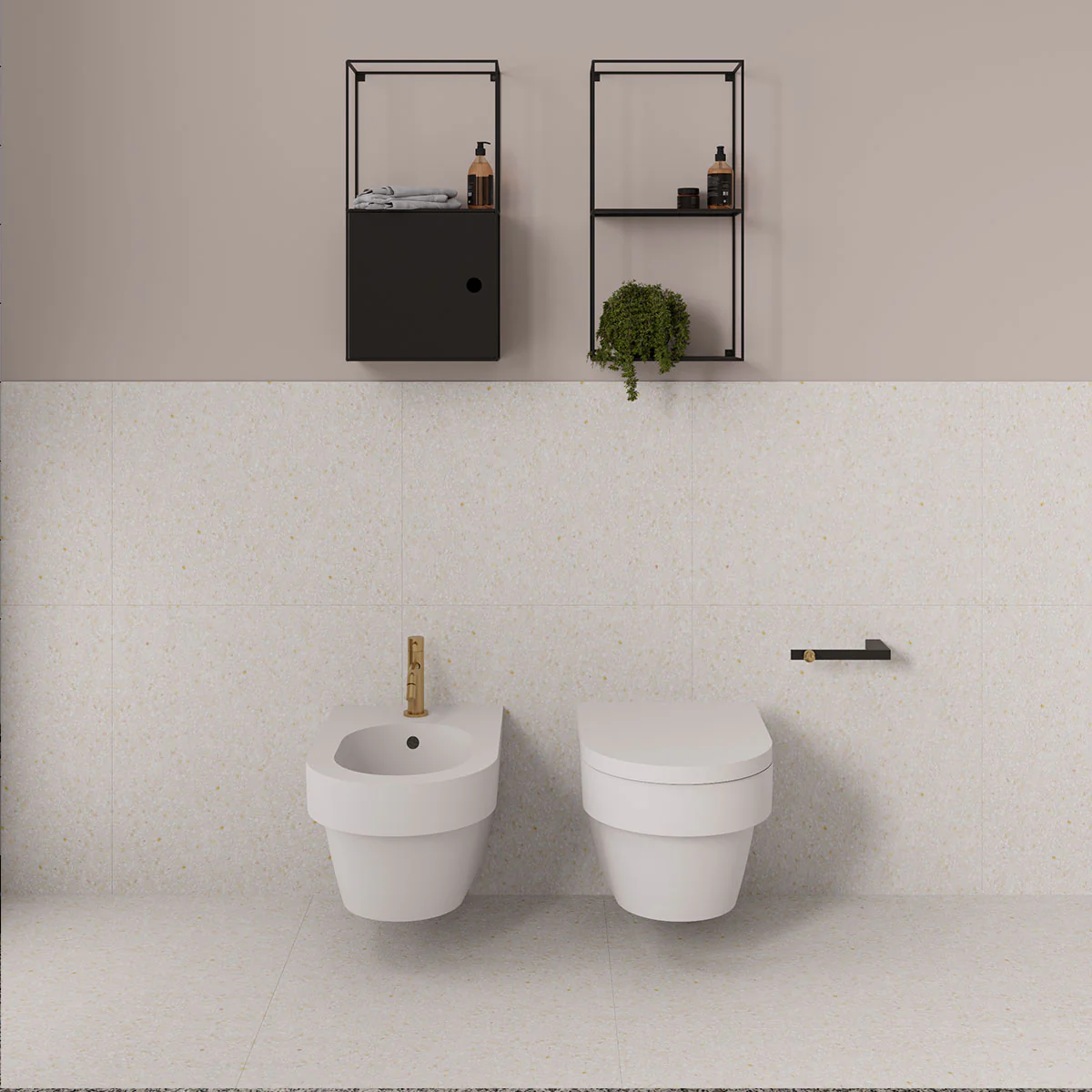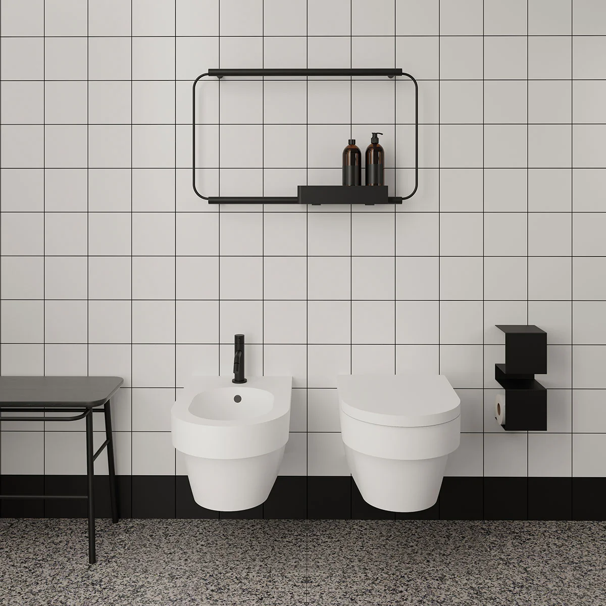 Vaso sospeso in ceramica bianca dal design essenziale dal design puro e neutrale, che ne consente l’inserimento in tutte le ambientazioni di bagno contemporanee.