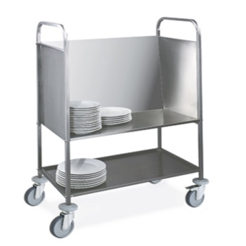 Struttura portante in tubo quadro di acciaio inox cm 2×2. Pareti in lamiera di acciaio inox AISI 304. Base appoggio piatti inclinata antiribaltamento. Ripiano inferiore inox. Ruote piroettanti Ø cm 12,5.