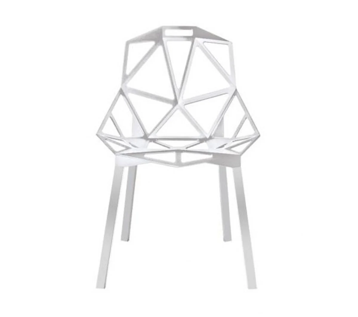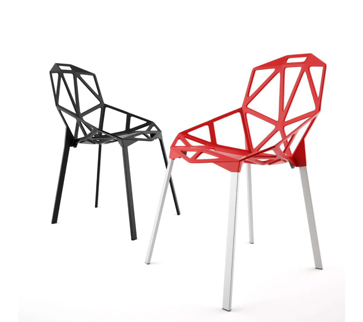 Inconfondibile il segno contemporaneo della Chair One, capofila della ormai classica linea di sedute Family One di Magis. Nata dalla creatività di Konstantin Grcic, è disponibile nella versione a quattro gambe e in altre edizioni che ne ampliano l’uso a 360°. Segno distintivo della Chair One è la composizione simmetrica di triangoli irregolari che costruisce la seduta, capolavoro di dinamismo e leggerezza, appoggiata alle quattro gambe a sezione rettangolare. Frutto della logica compositiva di sottrazione che ispira il designer tedesco, tecnicamente è concepita sfruttando le potenzialità dell’alluminio pressofuso. La gamma cromatica essenziale bianco, nero, grigio, alluminio lucido e rosso come unico colore – alleggerisce l’aspetto materico della struttura esaltando gli spazi vuoti. Insieme razionale e poetica, grafica e tridimensionale, la Chair One è un arredo dalla spiccata versatilità indoor e outdoor, impilabile e, soprattutto, confortevole.