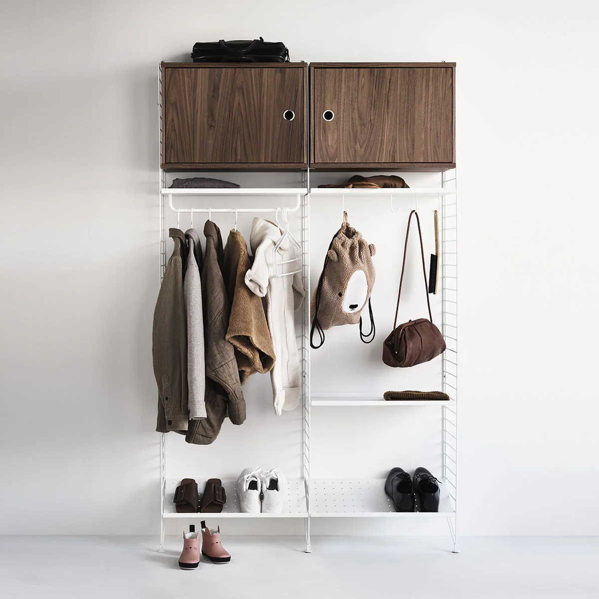 Prodotto dal 1949 in Svezia, String System è un rivoluzionario sistema che permette di realizzare molteplici configurazioni di scaffalature con pochi elementi facilissimi da montare. Divenuto un classico del design scandinavo, String System è una soluzione funzionale ed elegante per qualsiasi stanza della casa. La configurazione delle scaffalature String può essere modificata facilmente, rendendo String particolarmente adatta alle esigenze in costante evoluzione delle famiglie contemporanee. Tutte le configurazioni String prevedono il fissaggio a muro di pannelli metallici verticali (esistenti in diverse dimensioni), sui quali vengono ancorate mensole di diverse dimensioni e di vario genere (piane, inclinate, dotate di scomparti per alloggiare piccoli oggetti), piani di lavoro e mobiletti con caratteristiche diverse (ante scorrevoli, cassetti, ante trasparenti) tramite il sistema di aggancio brevettato String System.