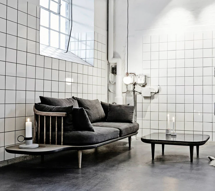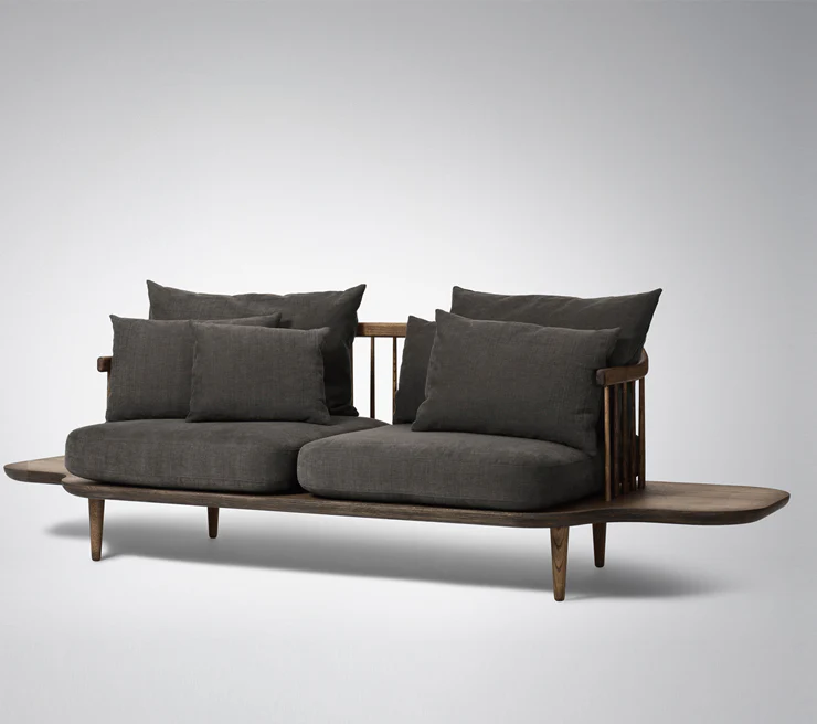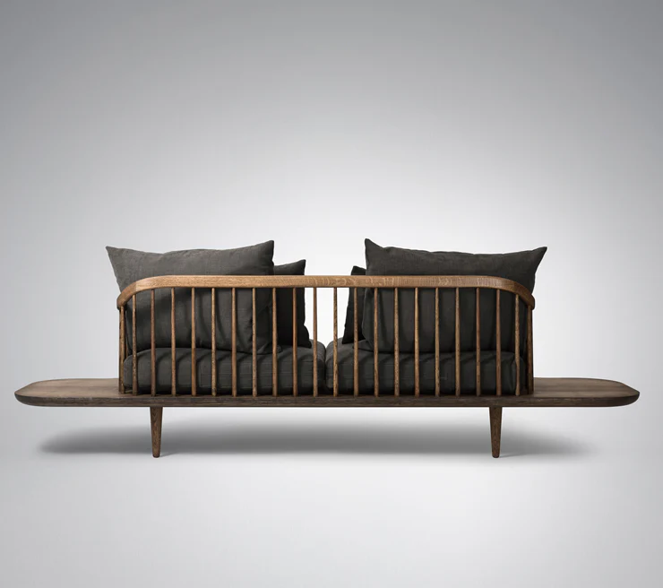 Un divano 100% danese, tra tradizione e modernità… Ideata dallo studio Space Copenhage la collezione Fly unisce innovazione e tradizione scandinava. Nel più puro stile nordico, il divano Fly presenta una splendida lavorazione del legno e una struttura a barre dall’aspetto scultoreo e incredibilmente aereo. Le dimensioni XXL, la profondità di seduta e i morbidi cuscini garantiscono un confort ottimale. Fly è ideale per allungarsi, raggomitolarsi… insomma, per un totale relax! Come ali, la struttura si proluga per creare dei tavolini da ogni lato del divano. Realizzato artigianalmente in Danimarca, il divano Fly necessita di una lavorazione d’eccellenza. Le linee semplici mettono in evidenza la lavorazione del legno. Il rovere affumicato è accuratamente tagliato in strisce che sono poi lavorate e assottigliate. La finitura ad olio dà al legno una splendida patina che diventa sempre più bella nel tempo. I cuscini sono rivestiti di tessuto di alta qualità grigio scuro. I 6 cuscini dello schienale (in dotazione) possono essere sistemati a piacere.