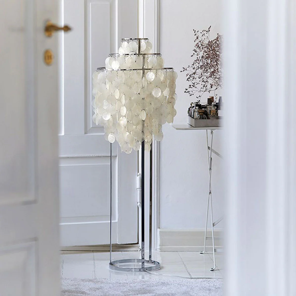 Lampada da terra con dischi di perle su telaio metallico a due anelli. I dischi sono collegati con piccoli anelli. I dischi di madreperla sono collegati con piccoli anelli metallici. Realizzata nel 1964 dal celebre Verner Panton, “Fun” è un oggetto unico, simbolo dell’incredibile talento del suo creatore. È una vera e propria scultura luminosa, che si anima al primo soffio di vento e riempie la stanza di riflessi magici. Questa lampada a sospensione riempie lo spazio con la sua presenza. La firma di Verner Panton è incisa sull’attacco metallico del cavo elettrico e un certificato di autenticità garantisce la provenienza della lampada, identica all’edizione originale.