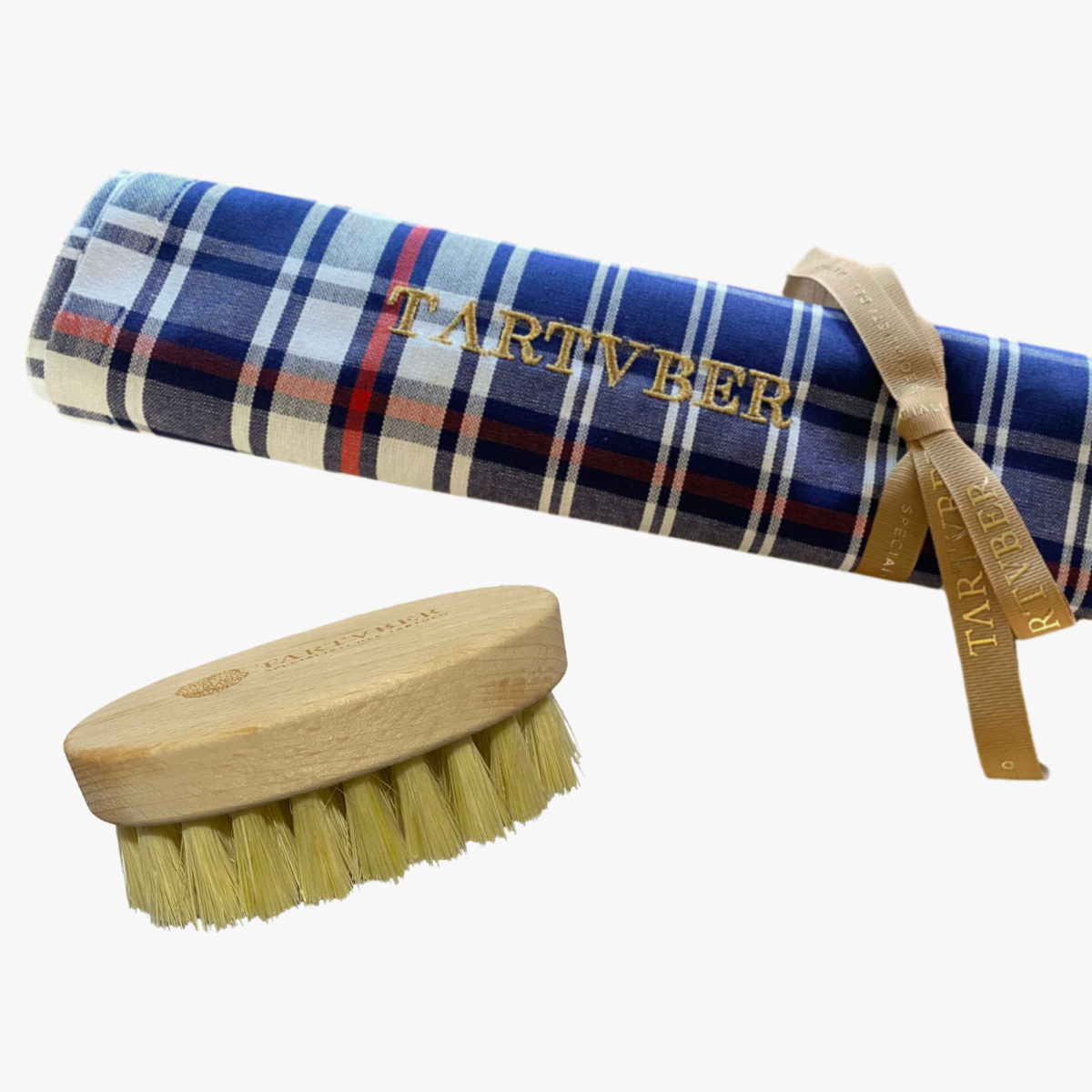 La spazzola da tartufi utile per rimuovere la terra in eccesso nonché lavare i tartufi in un secondo momento. Il canovaccio in puro cotone, per riporre elegantemente i tesori della terra, come appena cavati. Tutto elegantemente marchiato “Tartuber”.