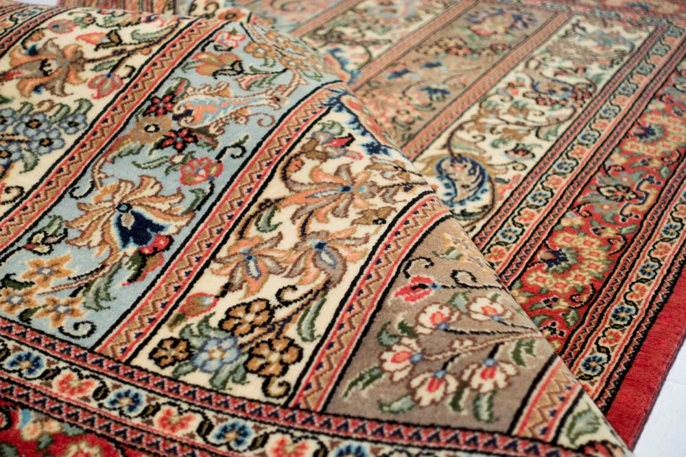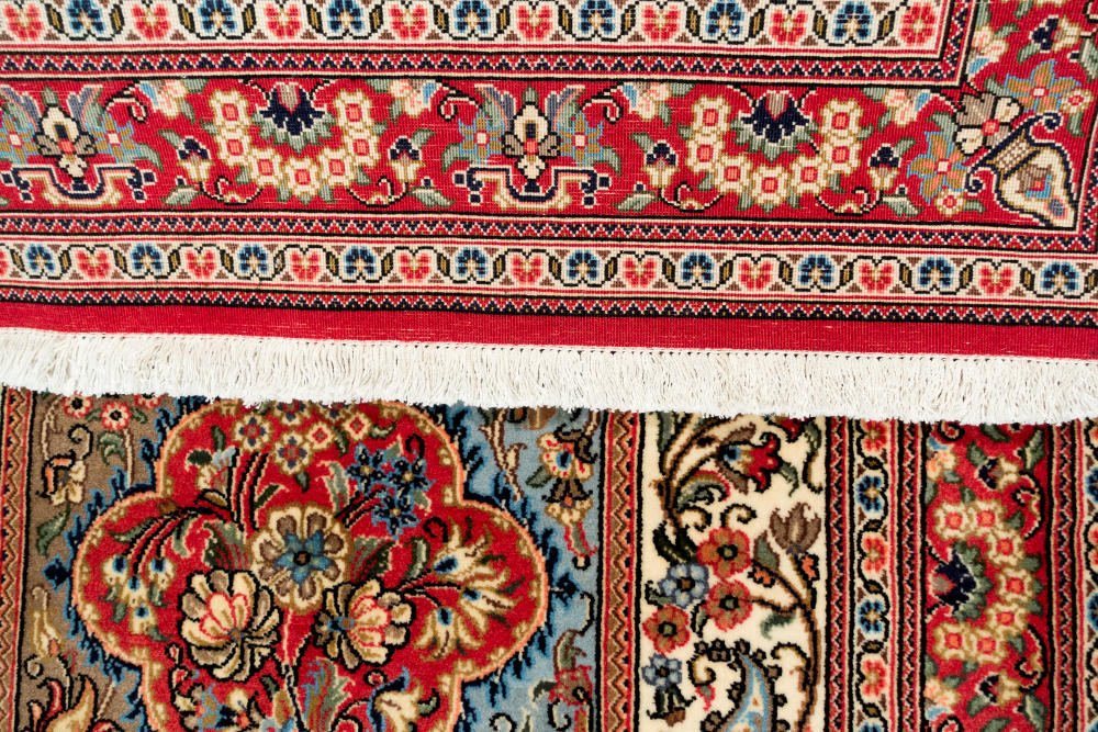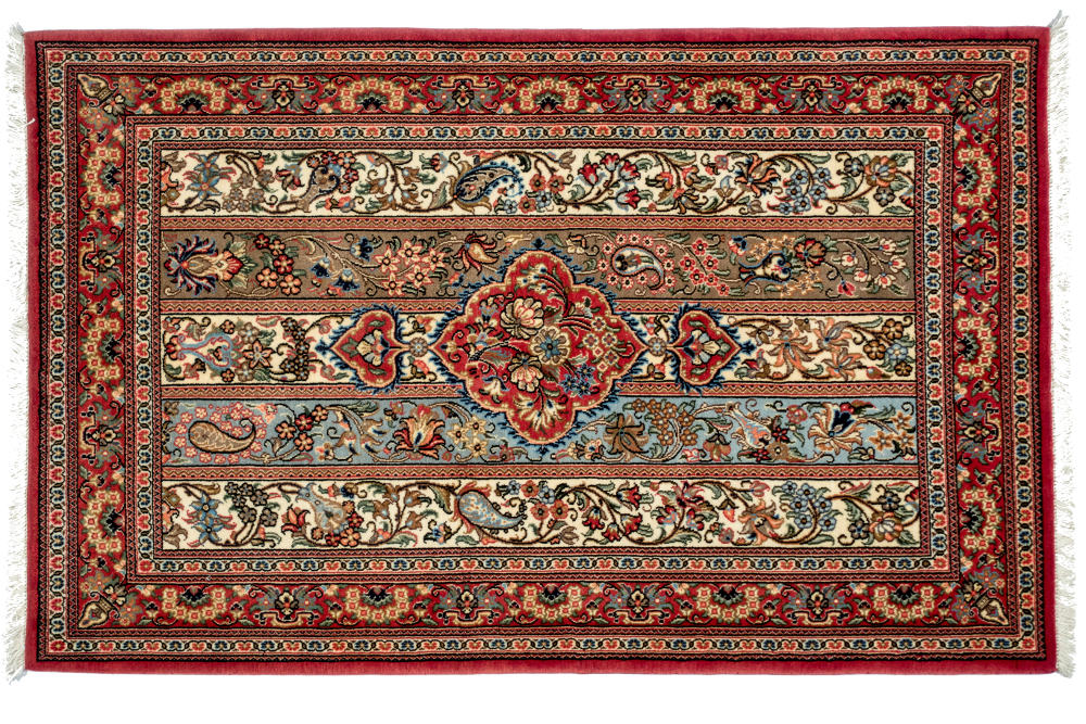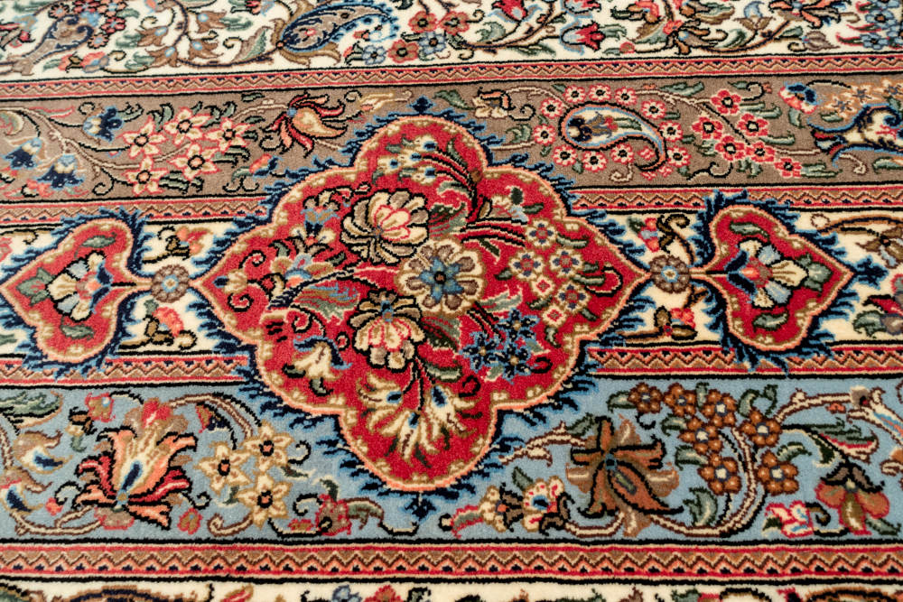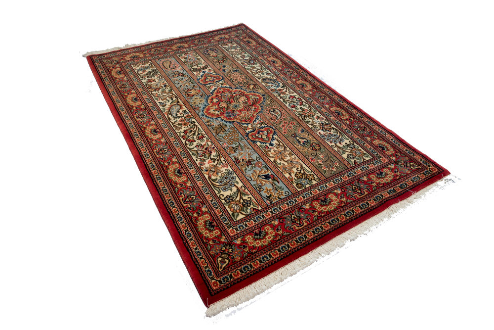 Tappeto persiano Kum Kurk rettangolare di piccole dimensioni, realizzato con lana Kurk, caratterizzato da un disegno classico con medaglione centrale su uno sfondo a righe con decori floreali. I tappeti di Kum sono tra i più importanti e pregiati tappeti iraniani, realizzati con lana pregiata Kork dal filato morbido e resistente con una annodatura perfetta e grande ricchezza di dettagli. L’alta qualità esecutiva viene resa ancor più raffinata da un’ampia gamma di colori dalle gradevoli sfumature e tonalità vivaci del rosso, blu, panna. Iconograficamente, i tappeti persiani Kum o Qum presentano disegni floreali a campo unito o medaglione centrale come nei tappeti persiani Kashan.