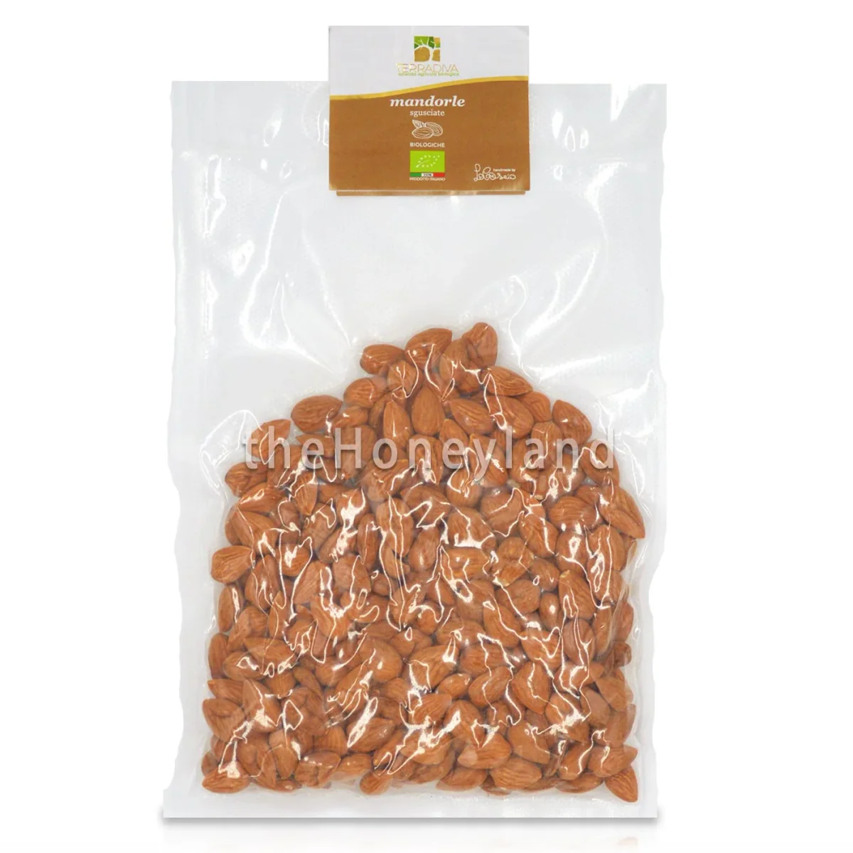 Mandorle pugliesi biologiche sgusciate, al naturale, selezionate e confezionate ancora oggi a mano. Mandorle coltivate dai nostri produttori nella zona di Minervino Murge alle porte del Parco Nazionale dell’Alta Murgia.