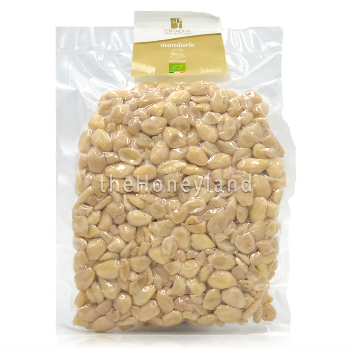 Mandorle pelate biologiche, selezionate e confezionate ancora oggi a mano. Mandorle coltivate nel Parco dell’Alta Murgia.