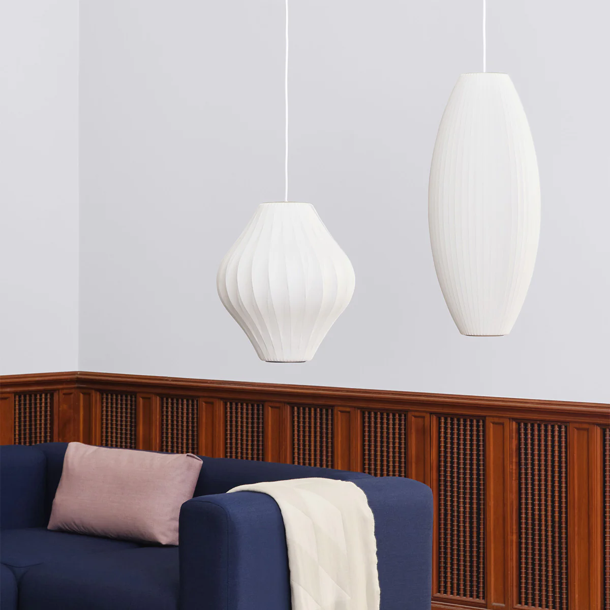 Progettata da George Nelson nel 1947, la serie di lampade a sospensione Nelson Bubble comprende una gamma di soluzioni di illuminazione a sospensione con diverse sagome sferiche. Ispirate a una serie di lampade a sospensione svedesi rivestite in seta, le forme organiche delle lampade sembrano fluttuare delicatamente in alto, offrendo una luce morbida e suggestiva. Disponibile nelle varianti Ball, Pear, Apple, Cigar, Saucer, Lantern e Propeller in diverse dimensioni.
