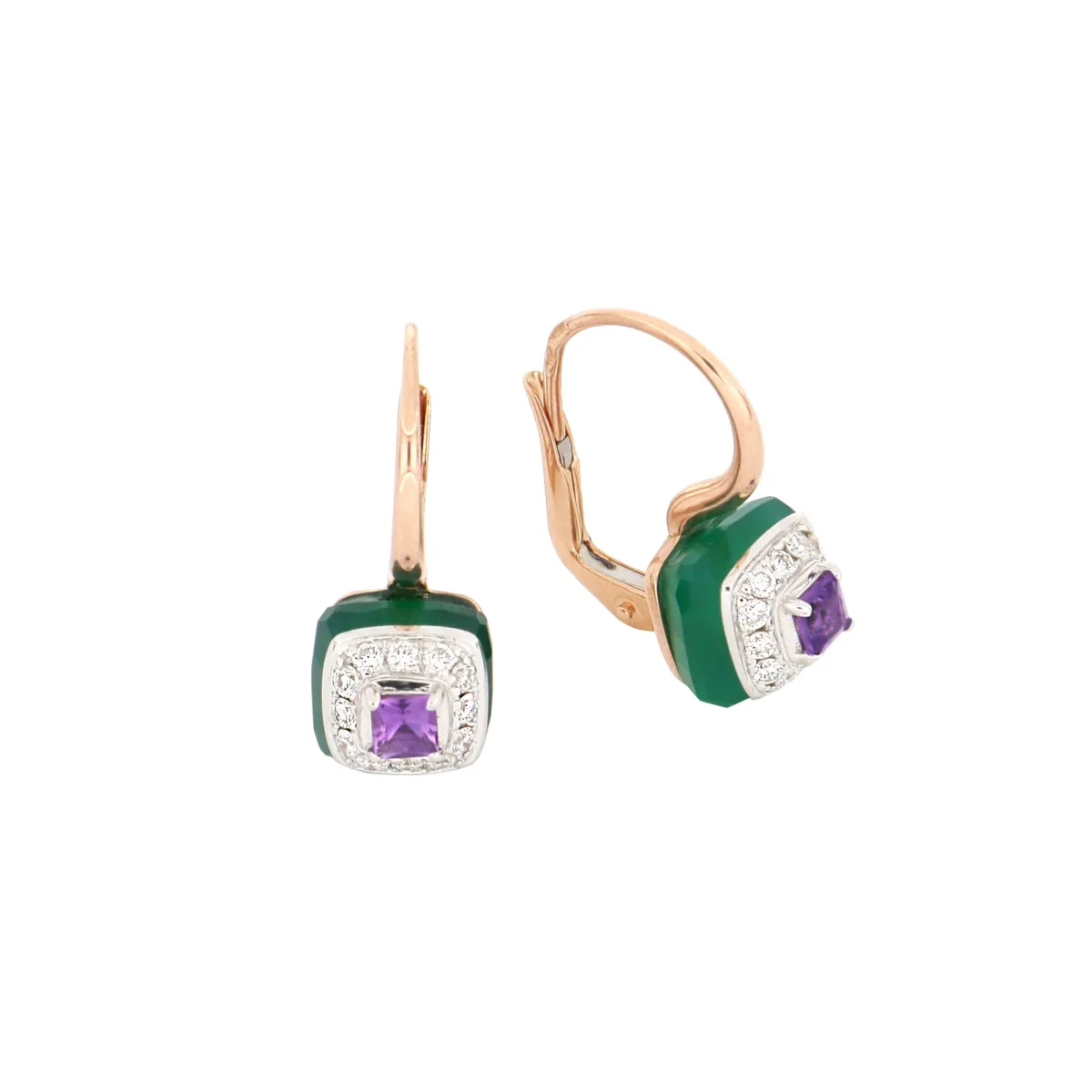 Orecchini in microfusione oro rosa 18 carati, pietra taglio cuscino onice verde da 5.00 ct e un pavé di diamanti in oro bianco 0.34 ct e ametista taglio quadrato (0.30 ct). Chiusura a monachella.