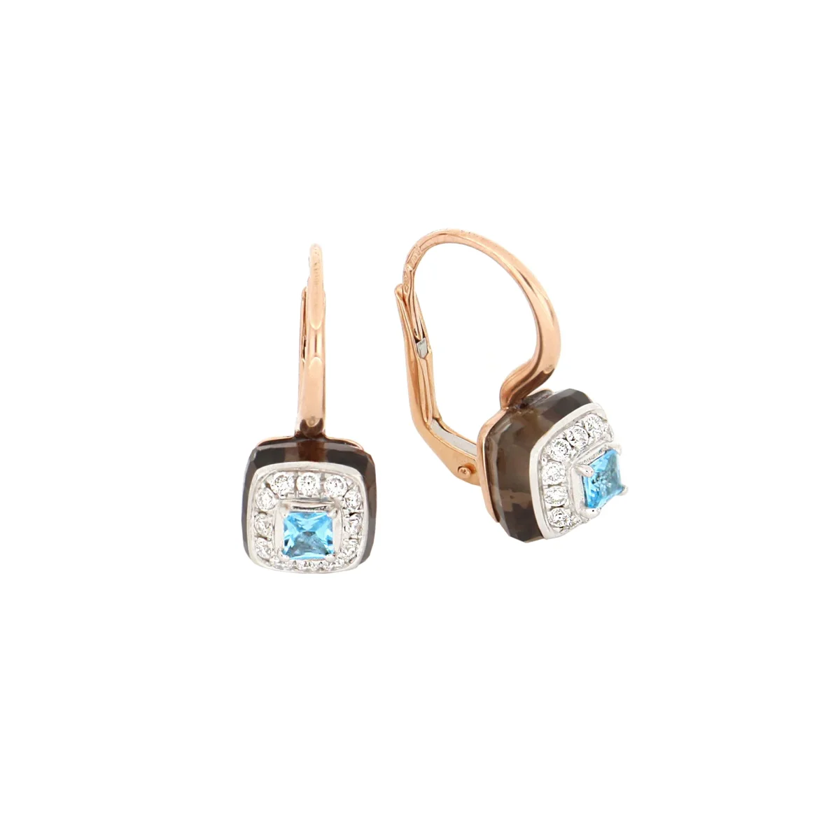 Orecchini in microfusione oro rosa, pietra taglio cuscino quarzo fumé 5.30 ct e pavé di diamanti in oro bianco 0.34 ct e topazio azzurro taglio quadrato 0.30 ct. Chiusura a monachella.