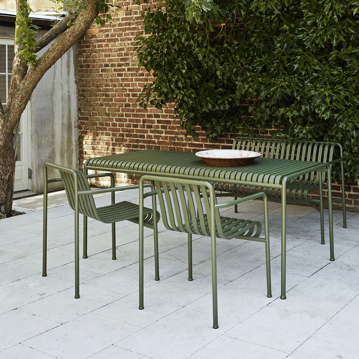 Caratterizzata da essenzialità grafica e dalla sua incredibile leggerezza visiva, la collezione Palissade porta come stendardo lo stile inimitabile dei fratelli Bouroullec. Molto ricca, si compone di tredici elementi: sedia con e senza braccioli, poltrone di diverse dimensioni e livelli di confort, panche, sgabelli, tavoli… Il tutto permette di allestire una zona pranzo o relax in giardino o sul terrazzo, ma anche in luoghi pubblici. Molto omogenea dal punto di vista estetico, Palissade utilizza dei tubi rotondi per le strutture e la base, associati a lunghe bande rettangolari che costituiscono la seduta. Abbozzata sul piano ergonomico, questa collezione offre un eccellente confort di seduta, anche senza cuscini.