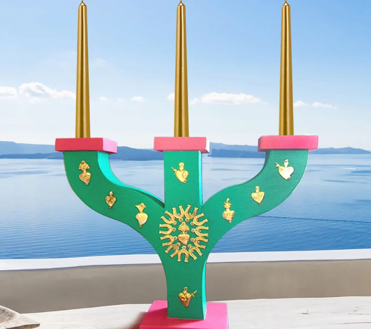 Portacandele in legno a bracci multipli impreziosito da ciondoli devozionali “Milagros” unici applicati su entrambi i lati. Ogni pezzo è unico. Le candele non sono incluse, ma è facile trovare il colore che si preferisce on line! Diametro del foro delle candele: 2 cm