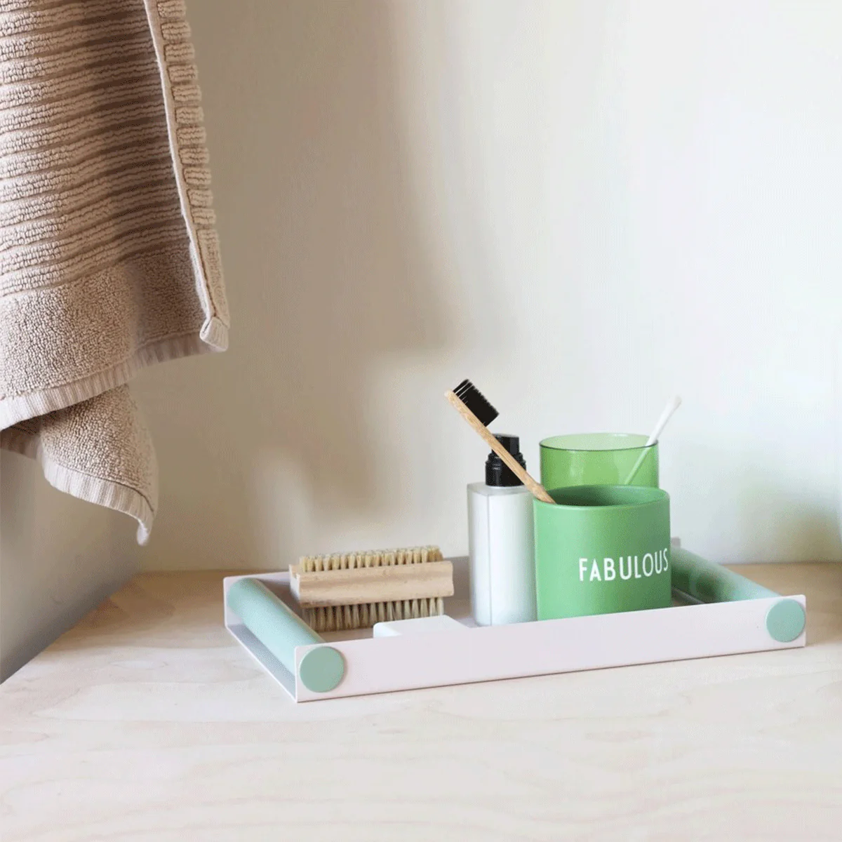 Vassoio da decorazione e da portata in tenui colori con finitura opaca. Perfetto come elemento decorativo o per riporre oggetti di uso comune, in soggiorno o nel bagno.