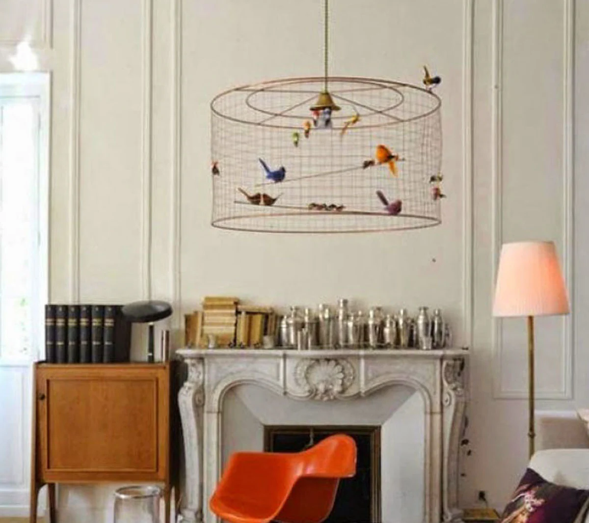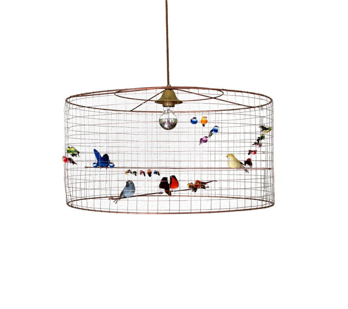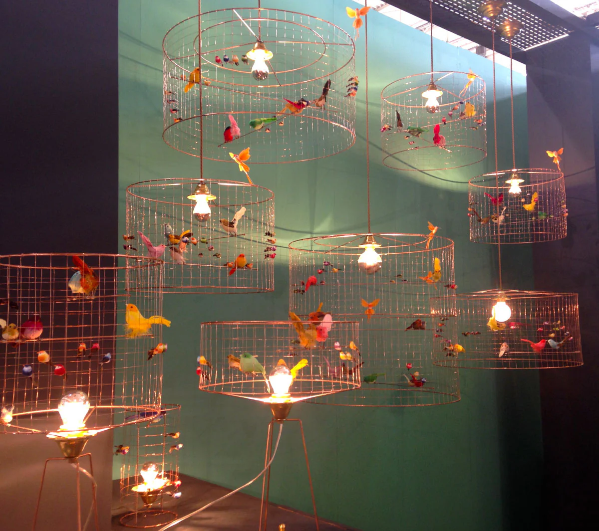 Le lampade di Challieres sono autentiche poesie: piccole o grandi voliere in maglia di rame, abitate da uccellini colorati che sembrano cinguettare allegri.