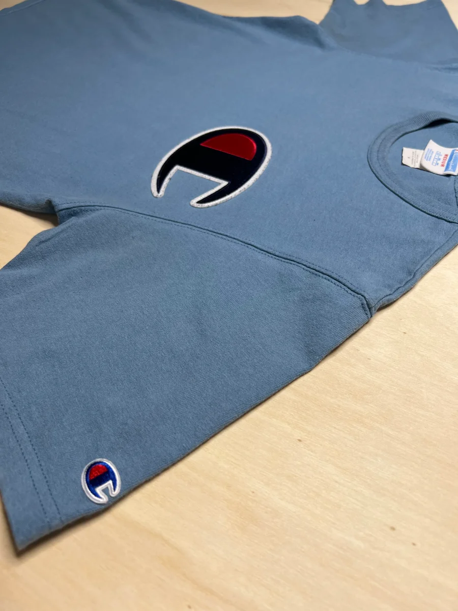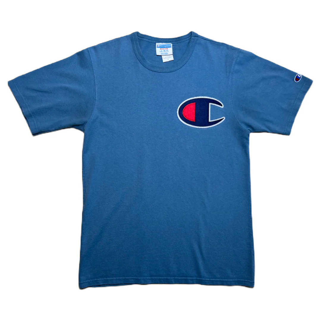 T-shirt Champion Original. Grafica in tessuto in rilievo di alta qualità.