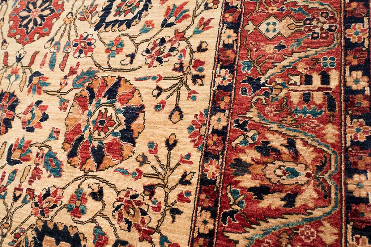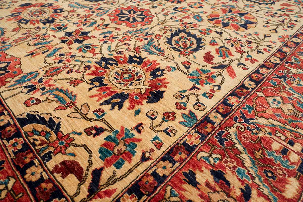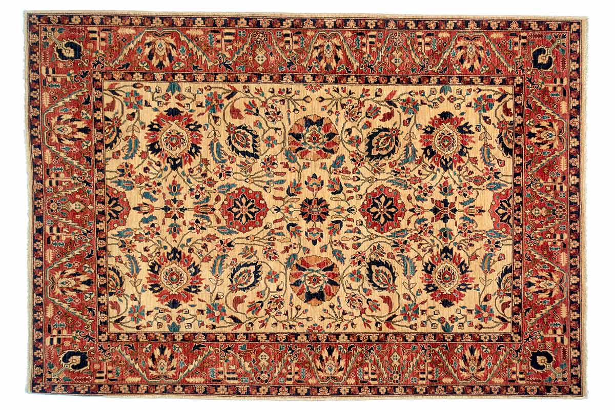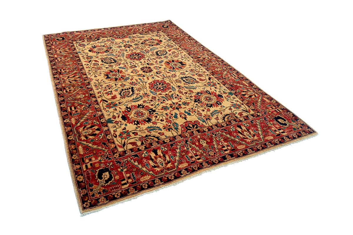 Tappeto afghano Shams realizzato a mano da esperti artigiani annodatori afgani con lane ritorte a mano e tinte vegetali. E’ un tappeto caratterizzato da raffinati disegni floreali e realizzato con materie prime e rifiniture pregiate. I colori utilizzati sono eleganti sfumature di oro e rosso. Questo tappeto è particolarmente adatto per ambienti classici ma può convivere molto bene in case con arredamenti moderni.
