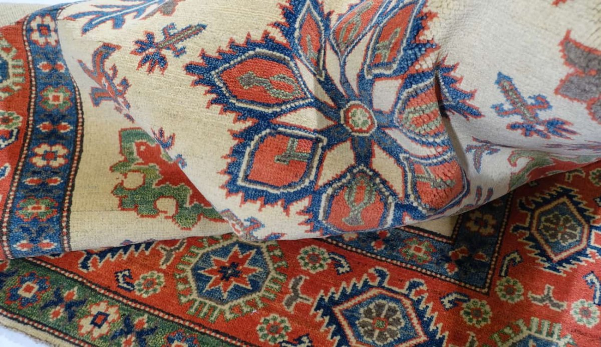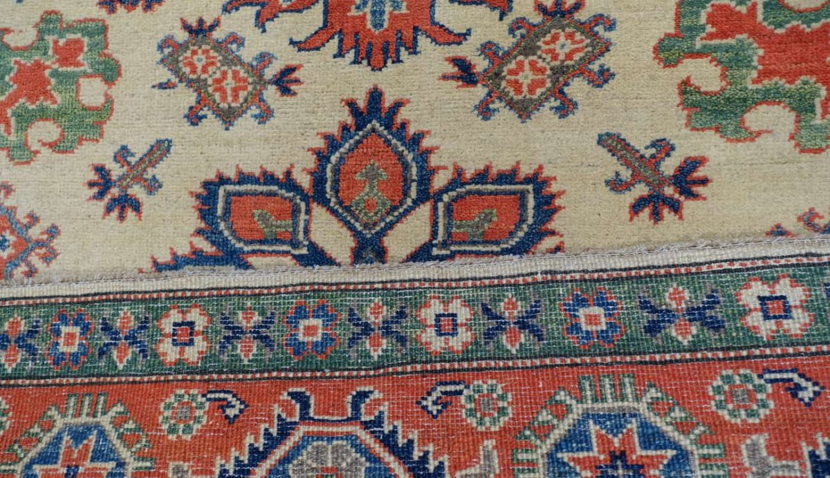 Questi tappeti sono annodati a mano in Pakistan. Il disegno si ispira ai motivi geometrici russi e la lana viene tinta con pigmenti naturali. Sono tappeti resistenti all usura, dai colori vivaci. Per ottenere la caratteristica lucentezza, le lane sono ritorte a mano. In questo esemplare la base è color oro, la cornice rossa. Questo tappeto Kazak è decorato da motivi geometrici sia nel campo che nella cornice.