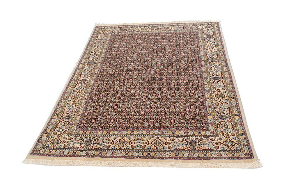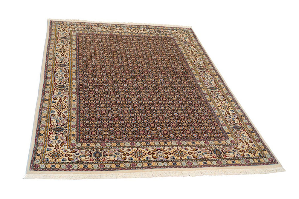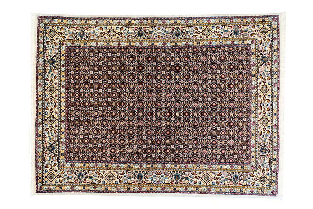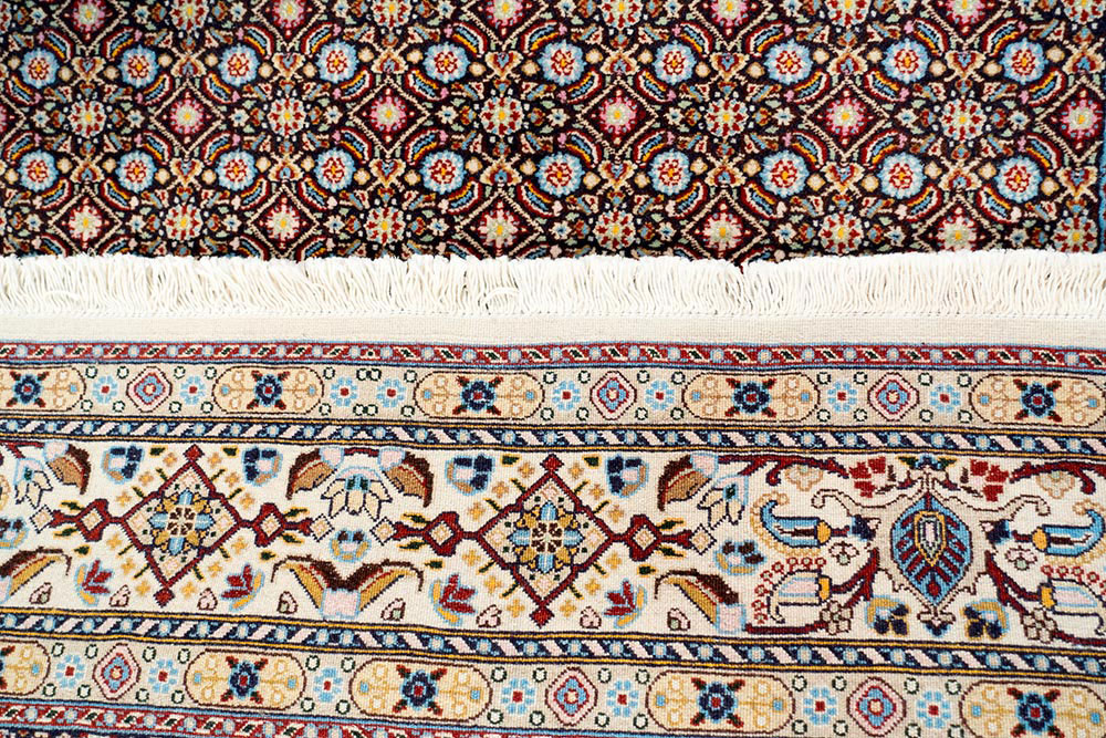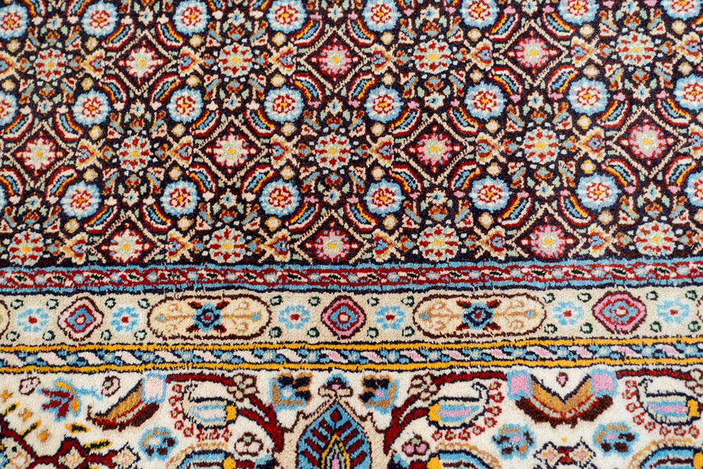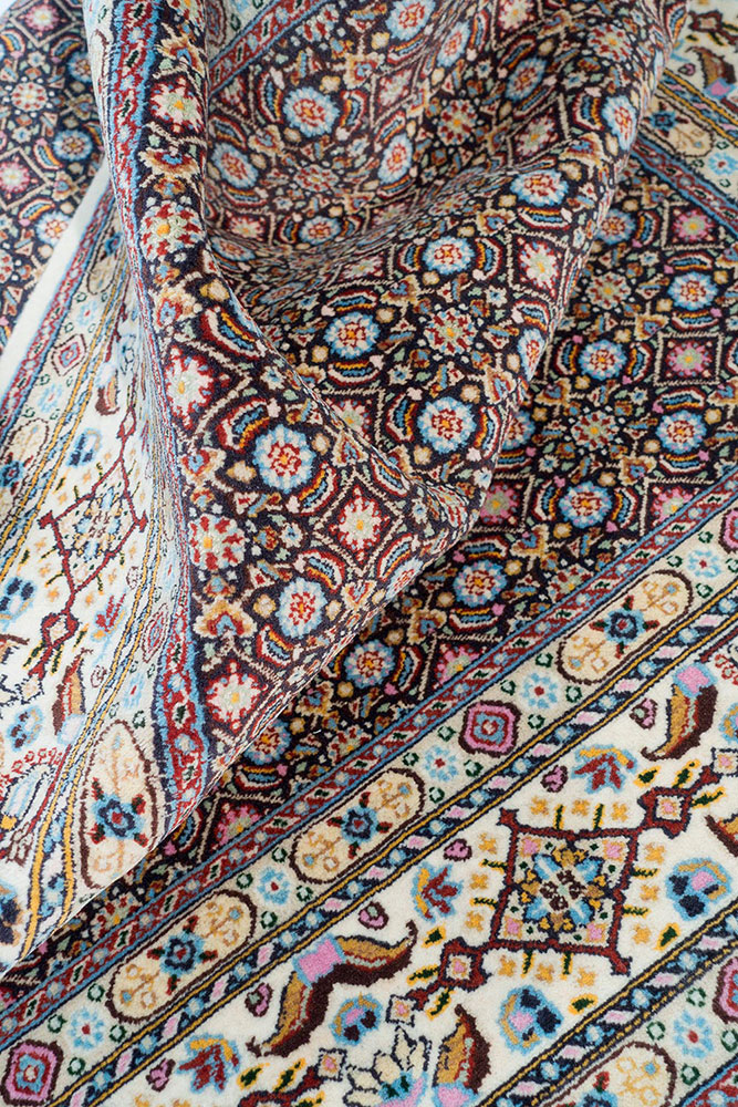 Tappeto iraniano misto seta caratterizzato da un campo vuoto (all over) con una prevalenza di blu e una cornice chiara. Tappeto robusto che riesce a sopportare frequenti calpestii quotidiani.
