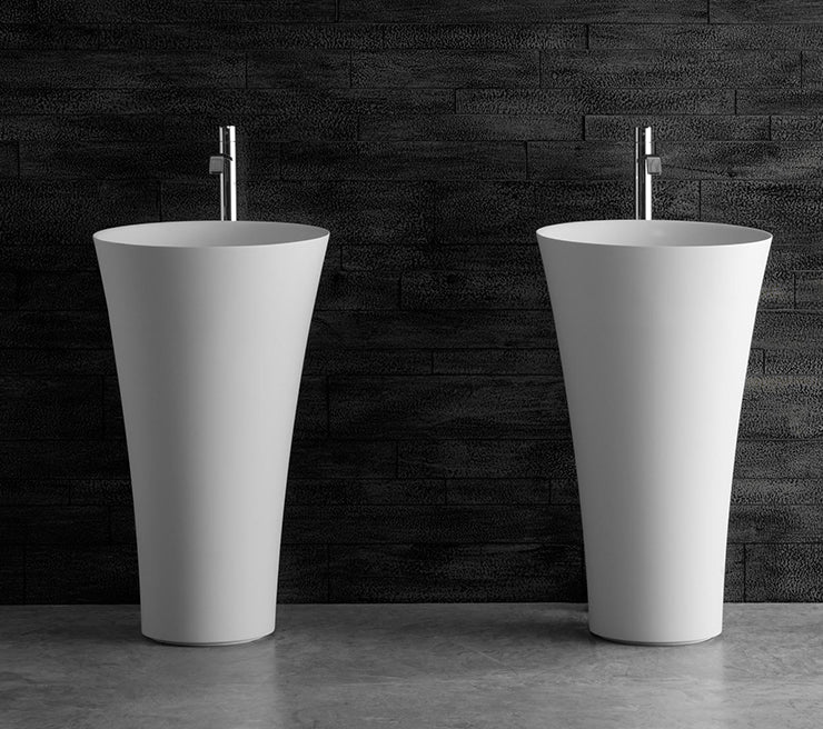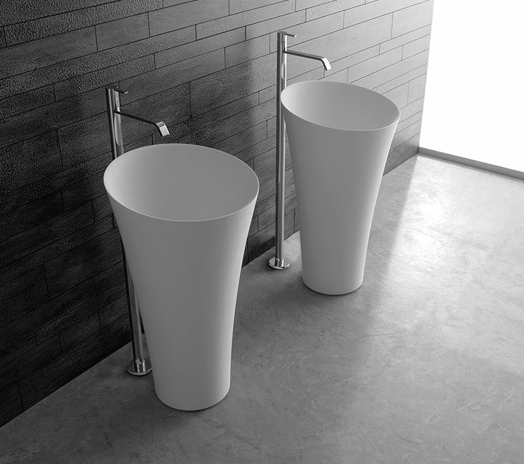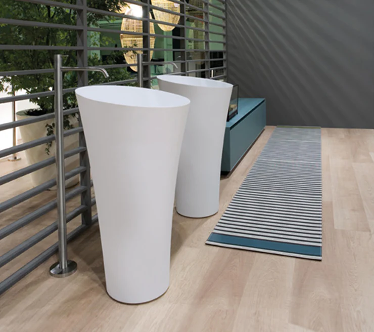 Tuba non è stato pensato solo come semplice lavabo ma come una vera e propria scultura per trasmettere emozioni e arredare lo spazio. Elegante e discreto il lavabo si adatta ad atmosfere soft e ambienti sofisticati. Un lavabo non si limita al suo mero uso di contenitore dell’acqua, ma è anch’esso uno strumento per trasmettere emozioni e arredare uno spazio. La sagoma, che ricorda lo stelo di un fiore, ha base stretta e sommità che va ad allargarsi. Tuba è realizzato in Flumood bianco ed è previsto nella versione soprapiano o freestanding.