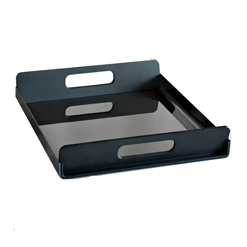 Vassoio rettangolare in acciaio inossidabile 18/10 lucido con manici in resina termoplastica, nero.
