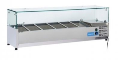 Vetrina refrigerata statica Dimensioni mm.1400 x 385 x 425 interamente in acciaio inox. Temperatura + 2 / +8°. Vetri di protezione. 230V 50HZ. Evaporatore in rame a tubo unico senza saldature.